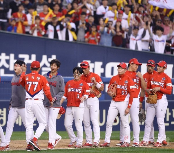 28일 서울 잠실야구장에서 열린 ‘2017 타이어뱅크 KBO리그’ 포스트시즌 한국시리즈 3차전 KIA타이거즈와 두산베어스의 경기에서 KIA가 6-3으로 승리하며 시리즈 전적 2승 1패를 기록했다. 경기 후 KIA 선수들이 김기태 감독과 기쁨을 나누고 있다.