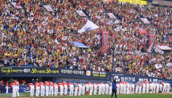 28일 서울 잠실야구장에서 열린 ‘2017 타이어뱅크 KBO리그’ 포스트시즌 한국시리즈 3차전 KIA타이거즈와 두산베어스의 경기에서 KIA가 6-3으로 승리하며 시리즈 전적 2승 1패를 기록했다. 경기 후 KIA 선수들이 3루 원정 응원단을 향해 고개 숙여 인사를 하고 있다.