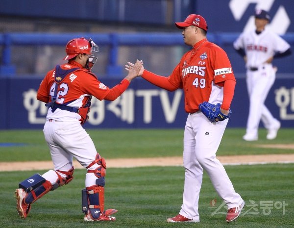 28일 서울 잠실야구장에서 열린 ‘2017 타이어뱅크 KBO리그’ 포스트시즌 한국시리즈 3차전 KIA타이거즈와 두산베어스의 경기에서 KIA가 6-3으로 승리하며 시리즈 전적 2승 1패를 기록했다. 경기 후 KIA 한승택과 마무리 김세현(오른쪽)이 기쁨을 나누고 있다.
