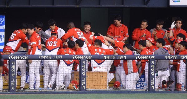 28일 서울 잠실야구장에서 ‘2017 타이어뱅크 KBO리그’ 포스트시즌 한국시리즈 3차전 KIA타이거즈와 두산베어스의 경기가 열렸다. 9회초 2사 3루 KIA 대타 나지완이 두산 김강률을 상대로 투런홈런을 친 후 더그아웃에서 동료들의 축하를 받고 있다.
