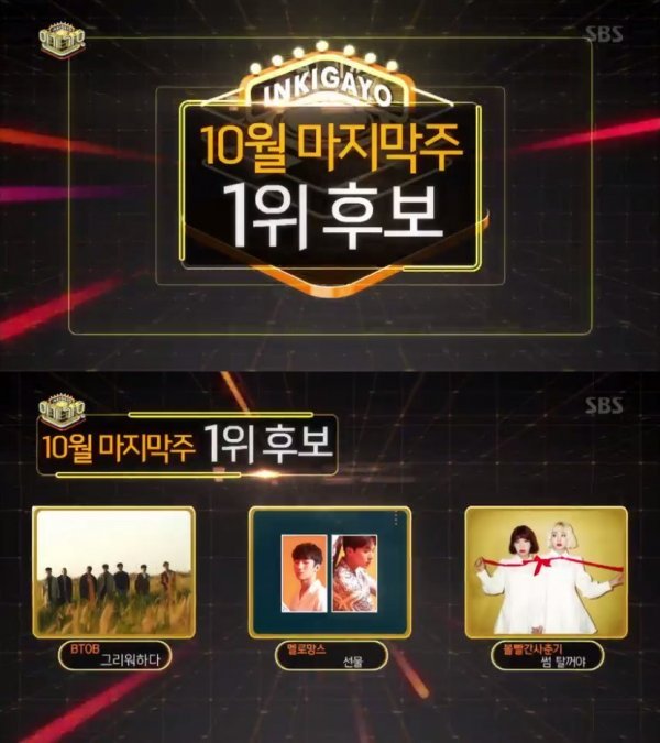 29일 오후 방송된 SBS 음악 방송 프로그램 ‘인기가요’에서는 비투비, 멜로망스, 볼빨간 사춘기가 1위 후보에 오른 장면이 그려졌다.