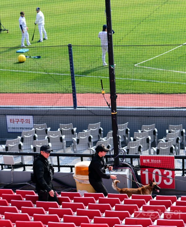 29일 서울 잠실야구장에서 ‘2017 타이어뱅크 KBO리그’ KIA 타이거즈와 두산 베어스의 한국시리즈 4차전 경기가 열린다. 경기 전 경찰특공대가 탐지견과 함께 야구장을 순찰하고 있다.