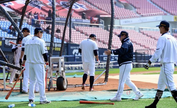 29일 서울 잠실야구장에서 ‘2017 타이어뱅크 KBO리그’ KIA 타이거즈와 두산 베어스의 한국시리즈 4차전 경기가 열린다. 경기 전 두산 김태형 감독이 선수들의 훈련에 대해 이야기하고 있다.