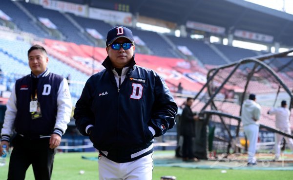 29일 서울 잠실야구장에서 ‘2017 타이어뱅크 KBO리그’ KIA 타이거즈와 두산 베어스의 한국시리즈 4차전 경기가 열린다. 경기 전 두산 김태형 감독이 선수들의 훈련을 바라보고 있다.