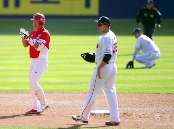 29일 서울 잠실야구장에서 ‘2017 타이어뱅크 KBO리그’ 포스트시즌 한국시리즈 4차전 KIA타이거즈와 두산베어스 경기가 열렸다. 1회초 1사 KIA 김주찬이 중전 2루타를 치고 2루에서 기뻐하고 있다.