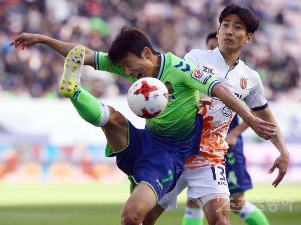 29일 전주월드컵경기장에서 ‘KEB하나은행 2017 K리그 클래식’ 36라운드 전북현대와 제주UTD의 경기가 열렸다. 전반 전북현대 한교원이 제주UTD 정운과 볼 경합을 벌이고 있다.
