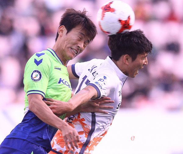29일 전주월드컵경기장에서 ‘KEB하나은행 2017 K리그 클래식’ 36라운드 전북현대와 제주UTD의 경기가 열렸다. 전반 전북현대 한교원과 제주UTD 정운(오른쪽)이 치열한 헤딩 경합을 벌이고 있다.