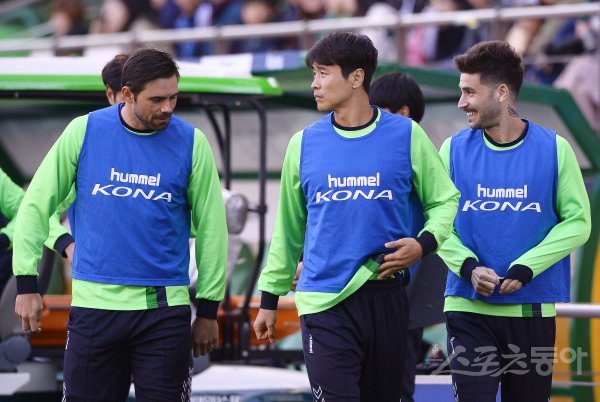 29일 전주월드컵경기장에서 ‘KEB하나은행 2017 K리그 클래식’ 36라운드 전북현대와 제주UTD의 경기가 열렸다. 전반 전북현대 이동국(가운데)이 몸을 풀기 위해 벤치에서 나오고 있다.