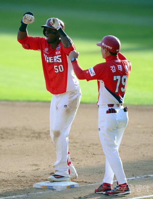 29일 서울 잠실야구장에서 ‘2017 타이어뱅크 KBO리그’ 포스트시즌 한국시리즈 4차전 KIA타이거즈와 두산베어스 경기가 열렸다. 7회초 2사 1,3루 KIA 버나디나가 1타점 적시타를 치고 1루에서 기뻐하고 있다.
