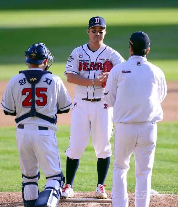 29일 서울 잠실야구장에서 ‘2017 타이어뱅크 KBO리그’ 포스트시즌 한국시리즈 4차전 KIA타이거즈와 두산베어스 경기가 열렸다. 선발 투수로 등판한 두산 유희관이 7회초 1사 2루 상황에서 교체되고 있다.