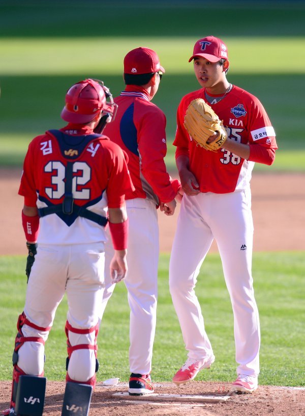 29일 서울 잠실야구장에서 ‘2017 타이어뱅크 KBO리그’ 포스트시즌 한국시리즈 4차전 KIA타이거즈와 두산베어스 경기가 열렸다. 선발 투수로 등판한 KIA 임기영이 6회말 2사 2루 상황에서 교체되고 있다.