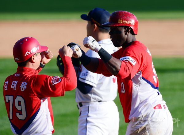29일 서울 잠실야구장에서 ‘2017 타이어뱅크 KBO리그’ KIA 타이거즈와 두산 베어스의 한국시리즈 4차전 경기가 열렸다. 7회초 2사 1, 3루에서 KIA 버나디나가 1타점 적시타를 치고난 뒤 김태룡 코치와 하이파이브를 나누고 있다.