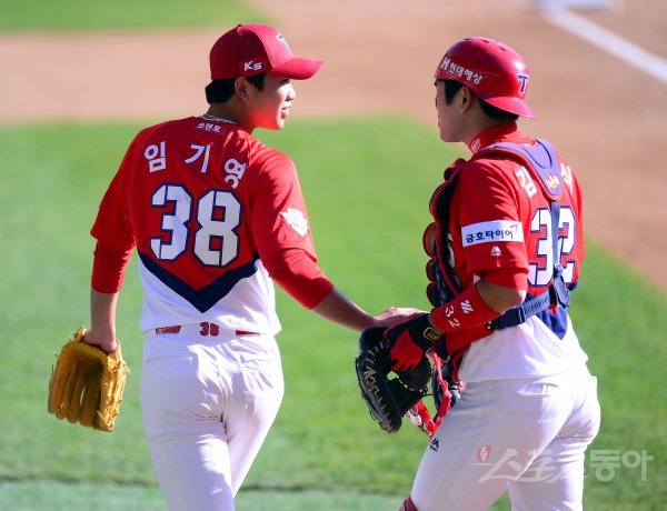 29일 서울 잠실야구장에서 ‘2017 타이어뱅크 KBO리그‘ 포스트시즌 한국시리즈 4차전 KIA타이거즈와 두산베어스 경기가 열렸다. 선발 투수로 등판한 KIA 임기영이 3회말 수비를 마치고 포수 김민식과 이야기 하고 있다. 잠실 | 김종원 기자 won@donga.com