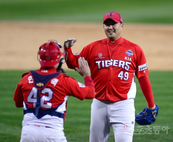 29일 서울 잠실야구장에서 ‘2017 타이어뱅크 KBO리그’ 포스트시즌 한국시리즈 4차전 KIA타이거즈와 두산베어스 경기가 열렸다. 5-1 승리를 거두며 시리즈 전적 3승 1패를 기록한 후KIA 김세현이 기뻐하고 있다.