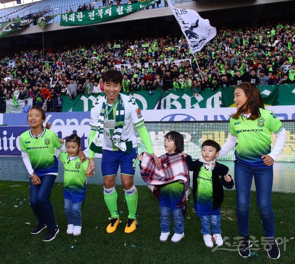 29일 전주월드컵경기장에서 열린 ‘KEB하나은행 2017 K리그 클래식’ 36라운드 전북현대와 제주UTD의 경기에서 전북현대가 3-0 승리를 거두며 남은 경기와 상관없이 우승을 확정지으며 통산 5회 우승을 달성했다. 경기 후 전북현대 이동국이 가족들과 함께 세리머니를 하고 있다.