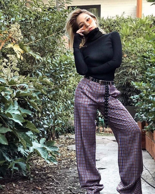 또 다른 사진에서 볼륨감 있는 몸매를 돋보이게 하는 핏한 터틀넥, 체크 프린트가 매력적인 와이드 팬츠를 매치하여 베이직한 아이템도 그녀만의 매력으로 완벽 소화했다.