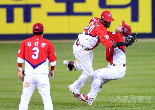 30일 서울 잠실야구장에서 ‘2017 타이어뱅크 KBO리그’ 포스트시즌 한국시리즈 5차전 KIA타이거즈와 두산베어스 경기가 열렸다. 6회말 2사 1루 KIA 버나디나가 두산 최주환의 플라이볼을 잡으며 안치홍과 충동하고 있다.