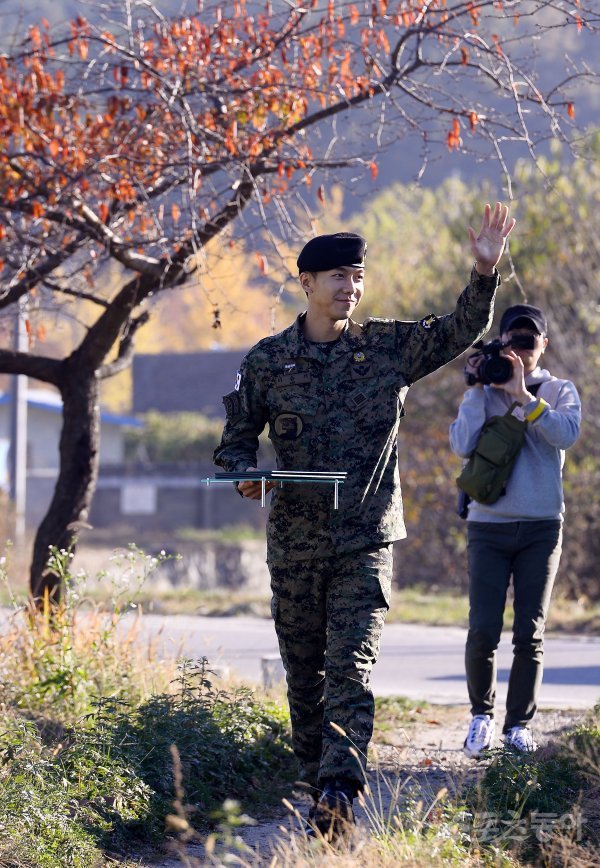 31일 충북 증평군 덕상리의 한 부대 정문 앞에서 가수 겸 배우 이승기가 전역행사를 위해 팬들에게 인사를 하며 입장하고 있다.