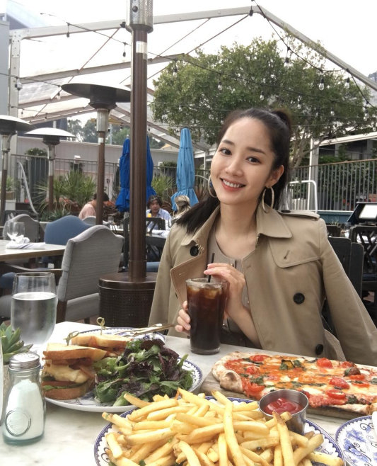 공개된 사진 속 박민영은 야외 테라스에서 만찬을 즐기고 있는 모습. 피자와 감자튀김을 앞에 두고 환한 미소를 지었다.