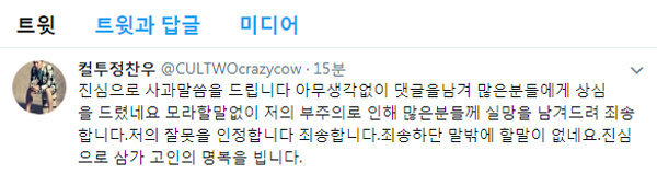 결국 논란이 번지자, 정찬우는 31일 자신의 트위터 계정을 통해 “진심으로 사과한다. 아무 생각 없이 댓글을 남겨 많은 분에게 상심을 드렸다. 뭐라 할 말 없이 내 부주의로 인해 많은 분에게 실망을 드려 죄송하다. 내 잘못을 인정한다. 죄송하다. 죄송하단 말밖에 할 말이 없다. 진심으로 삼가 고인의 명복을 빈다”라고 적으며 사과했다.