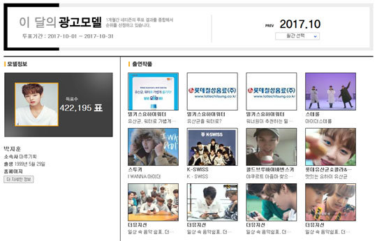 한국광고총연합회 광고정보센터가 10월1일~31일 한 달간 진행한 ‘네티즌 광고모델 투표’에서 워너원의 박지훈이 1위를 차지했다. 모델 호감도 평가에서도 96점을 받아 데뷔 3개월 만에 광고 요정으로 등극했다.