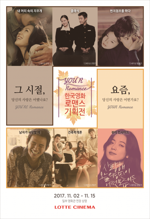 롯데시네마에서 11월 2일부터 15일까지 한국 로맨스 영화 기획전 “YOU’R Romance” 를 진행한다. 2주에 걸쳐 진행되는 이번 기획전은 한국 로맨스 영화를 대표하는 여섯 편을 선정해 두 가지 테마로 나뉘어 상영된다.