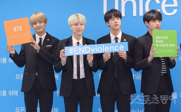 인기 그룹 방탄소년단의 뷔, 슈가, 진, 정국(왼쪽부터)이 1일 서울 마포구 서강로에 위치한 유니세프 한국위원회 대회의실에서 열린 ‘글로벌 아동 및 청소년 근절 캠페인 협약식’에 참석해 포즈를 취하고 있다.