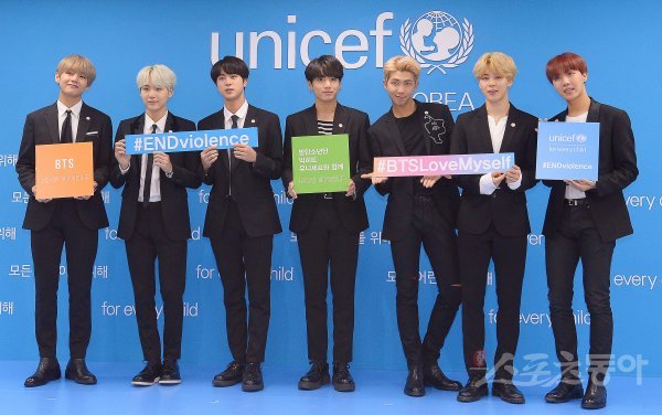 인기 그룹 방탄소년단이 1일 서울 마포구 서강로에 위치한 유니세프 한국위원회 대회의실에서 열린 ‘글로벌 아동 및 청소년 근절 캠페인 협약식’에 참석해 포즈를 취하고 있다.