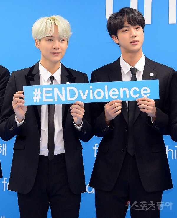 인기 그룹 방탄소년단의 슈가와 진(오른쪽)이 1일 서울 마포구 서강로에 위치한 유니세프 한국위원회 대회의실에서 열린 ‘글로벌 아동 및 청소년 근절 캠페인 협약식’에 참석해 포즈를 취하고 있다.
