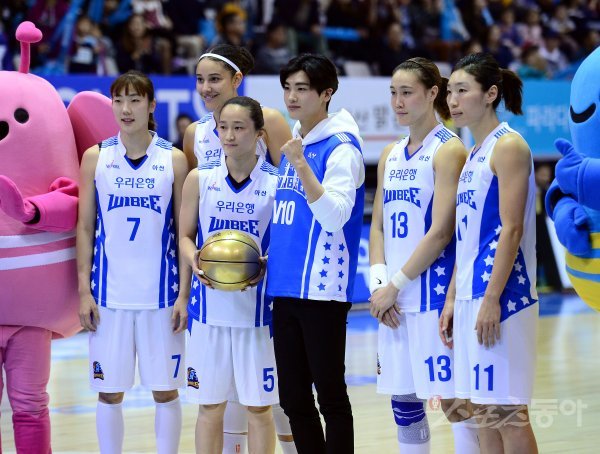 1일 아산이순신체육관에서 열린 ‘신한은행 2017∼2018 여자프로농구‘ KB스타즈와 우리은행 경기에서 탤런트 박형식이 시투를 마치고 우리은행 선수단과 기념촬영을 하고 있다.