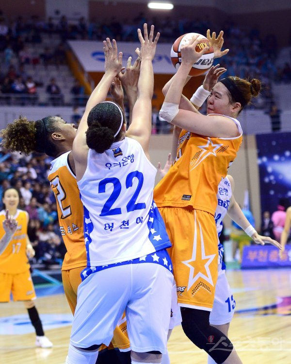 1일 아산이순신체육관에서 열린 ‘신한은행 2017∼2018 여자프로농구‘ KB스타즈와 우리은행 경기에서 KB스타즈 박지수가 우리은행 어천와에 앞서 리바운드 볼을 잡고 있다.