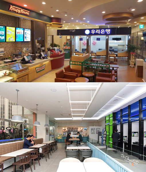 크리스피크림도넛 매장과 결합한 우리은행 ‘베이커리 인 브랜치’(위쪽), 커피숍 디 초콜릿 커피 앤드와 접목한 NH농협은행 ‘카페 인 브랜치. 은행점포가 카페 및 베이커리와 협업하거나 복합점포로 중무장하는 등 진화를 거듭하고 있다. 사진제공|우리은행·NH농협은행