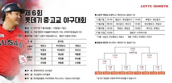 프로야구 롯데자이언츠가 11월 6일(월)부터 11월 12일(일)까지 기장-현대차 드림볼파크 및 사직야구장에서 2017년 제 6회 롯데기 부산 중ㆍ고교 야구대회를 개최한다.