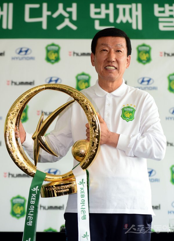 2일 전북 완주 전북현대 클럽 하우스에서 ‘K리그 클래식 우승기념 미디어 데이’가 열렸다. 전북 최강희 감독이 우승트로피를 들고 기념촬영을 하고 있다.