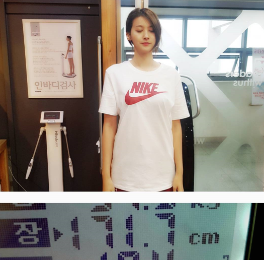 유인영은 두 눈을 꼭 감은 채 키를 재는 모습. 사진 속 신장은 171.7이지만 실제 유인영의 프로필에는 172cm로 나와 있다.