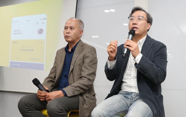 이용우(왼쪽)·윤호영 카카오뱅크 공동대표가 3일 서울시 용산구 카카오뱅크 서울오피스에서 열린 기자간담회에서 취재진의 질문에 답하고 있다. 사진제공|카카오뱅크