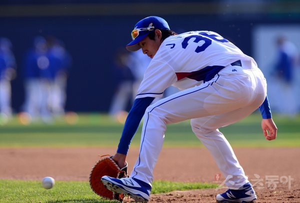 한국 야구국가대표팀이 오는 16일부터 4일간 일본 도쿄돔에서 열리는 ‘아시아 프로야구 챔피언십 2017’ 대회를 앞두고 5일 서울 잠실야구장에서 첫 소집 훈련을 가졌다. 야구대표팀 구자욱이 수비훈련을 하고 있다.