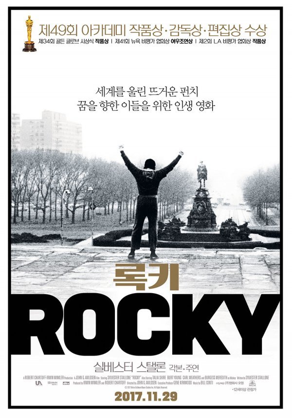 영화 ‘록키’가 오는 11월 29일로 개봉을 최종 확정하고, 40년 만에 다시 스크린에 찾아온다. 영화 ‘록키’는 필라델피아 뒷골목 4회전 복서 록키가 세계급 챔피언의 경기 상대자로 나서게 되며 진정한 인생의 챔피언이 되어가는 과정을 그려낸 작품. 1977년 제49회 아카데미 작품상, 감독상, 편집상 수상, 제34회 골든 글로브 작품상 수상으로 호평을 받았고, 세계적 흥행을 기록하며 화제를 모은 작품이다. 당시 무명 배우였던 실베스터 스탤론은 각본과 주연을 맡은 이 작품을 통해 세계적 스타로 발돋움 했고, 영화는 탄생 40여 년이 지난 지금까지도 ‘최고의 복싱영화’로 세계적 사랑을 받고 있다.