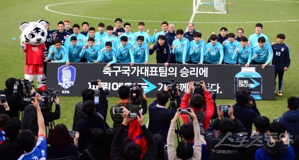 오는 10일 콜롬비아, 14일 세르비아와의 친선경기를 앞둔 한국 축구대표팀이 7일 수원월드컵 보조경기장에서 오픈트레이닝 행사를 가졌다. 대표팀 신태용 감독 및 코치들이 훈련에 앞서 팬들에게 인사하고 있다.