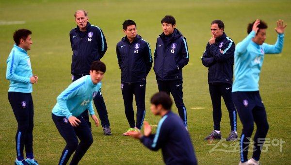 오는 10일 콜롬비아, 14일 세르비아와의 친선경기를 앞둔 한국 축구대표팀이 7일 수원월드컵 보조경기장에서 오픈트레이닝 행사를 가졌다. 대표팀 신태용 감독이 그란데, 미냐노 코치와 선수들의 훈련을 바라보고 있다.