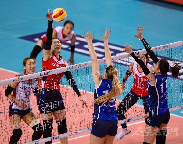 7일 화성종합실내체육관에서 열린 ‘2017-18 도드람 V리그’ 여자부 KGC인삼공사와 IBK기업은행 경기에서 KGC인삼공사 한수지가 IBK기업은행의 블로킹 사이로 스파이크 공격을 하고 있다.