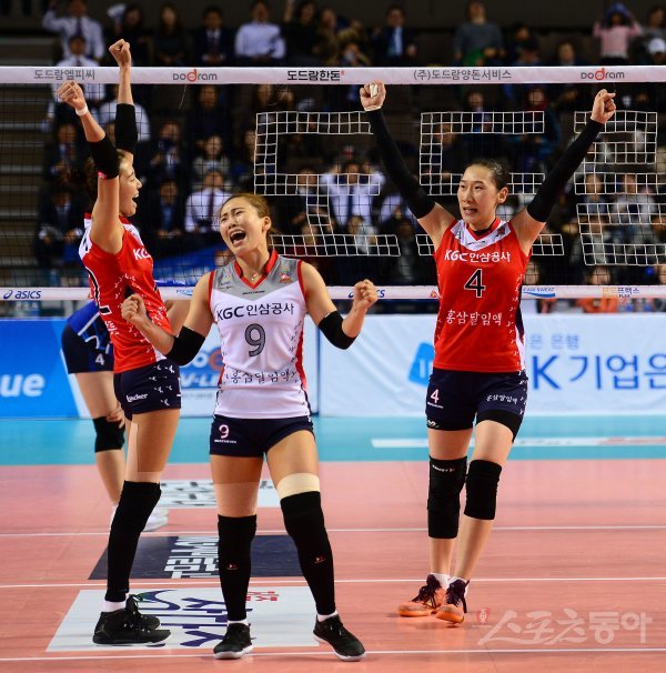 7일 화성종합실내체육관에서 열린 ‘2017-18 도드람 V리그’ 여자부 KGC인삼공사와 IBK기업은행 경기에서 세트스코어 3-2 승리를 거둔 KGC인삼공사 한수지와 선수들이 기뻐하고 있다.
