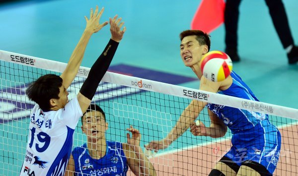 7일 인천 계양체육관에서 ‘2017-2018 도드람 V리그’ 인천 대한항공과 대전 삼성화재의 경기가 열렸다. 삼성화재 박철우가 대한항공 블로커를 피해 스파이크를 날리고 있다.