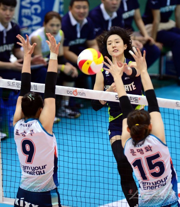 8일 경기도 수원실내체육관에서 ‘2017-2018 도드람 V리그’ 수원 현대건설과 서울 GS칼텍스의 경기가 열렸다. 현대건설 황연주가 GS칼텍스 블로커를 피해 스파이크를 날리고 있다.