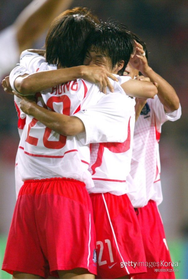 2002 월드컵 포르투갈전에서 16강 진출이 확정되자 포옹하는 홍명보와 박지성. 사진=게티이미지코리아