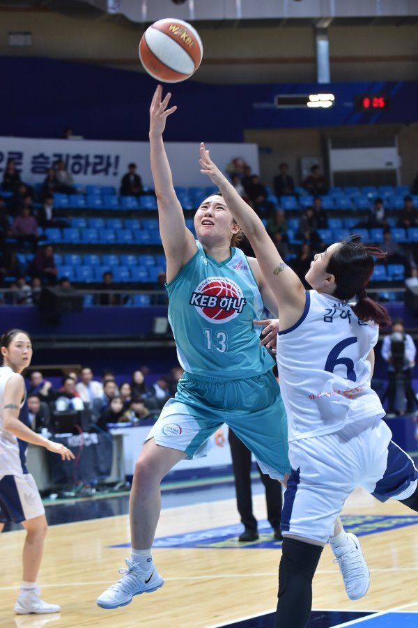후반 들어서는 KEB하나은행 김단비(17점)가 힘을 냈다. 2개의 3점슛을 포함해 3쿼터에만 12점을 몰아넣었다. 김단비를 앞세운 KEB하나은행은 3쿼터를 28-9로 압도하면서 55-54로 역전에 성공했다.