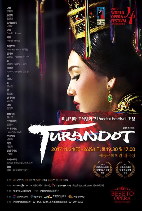 오는 11월 24일부터 26일 3일 간 세종문화회관 대극장에서 이탈리아 푸치니 페스티벌 재단과 공동으로 푸치니 오페라 ‘투란도트(TURANDOT)’를 공연한다. 이번 공연은 ‘2017 세계 4대 오페라’의 폐막 공연으로 축제의 대미를 장식하며 관객들의 눈과 귀를 사로잡을 예정.