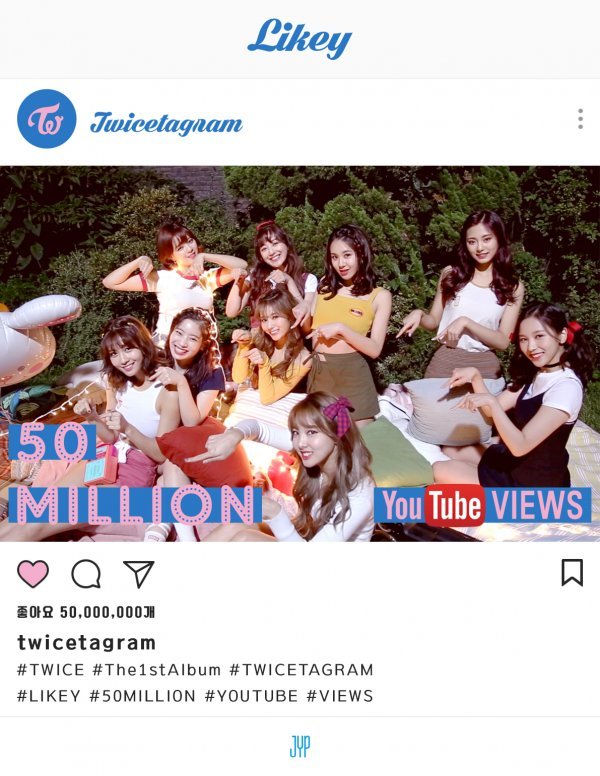 그룹 트와이스가 첫 정규앨범 타이틀곡 \'라이키(Likey)\' 뮤직비디오로 K팝 걸그룹 사상 최단시간만에 유튜브 조회수 5000만뷰를 넘어섰다. 가온차트 4관왕에도 오르면서 겹경사를 맞았다.