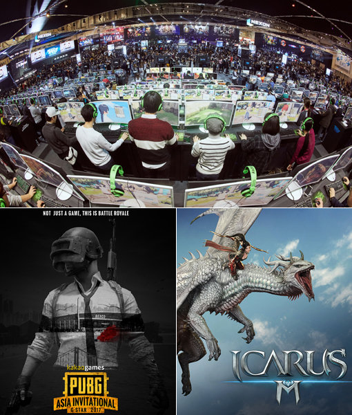 2017 지스타에서는 ‘피파온라인4’, ‘배틀라이트’, ‘에어’ 등 다양한 PC온라인 게임과 모바일 게임이 대거 선보일 예정이다. 사진은 지난해 지스타 행사장 전경(위쪽)-블루홀의 ‘카카오게임즈 2017 배틀그라운드 아시아 인비테이셔널’ 포스터(아래 왼쪽)-넷마블게임즈의 모바일 MMORPG 신작 ‘이카루스M’ 메인이미지. 사진제공|한국게임산업협회·블루홀·넷마블