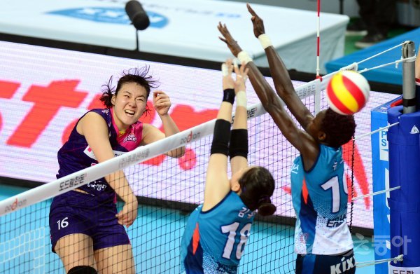 12일 서울 장충체육관에서 ‘2017-2018 도드람 V리그’ 서울 GS칼텍스와 인천 흥국생명의 경기가 열렸다. 흥국생명 이한비가 GS칼텍스 블로커를 피해 스파이크를 날리고 있다.